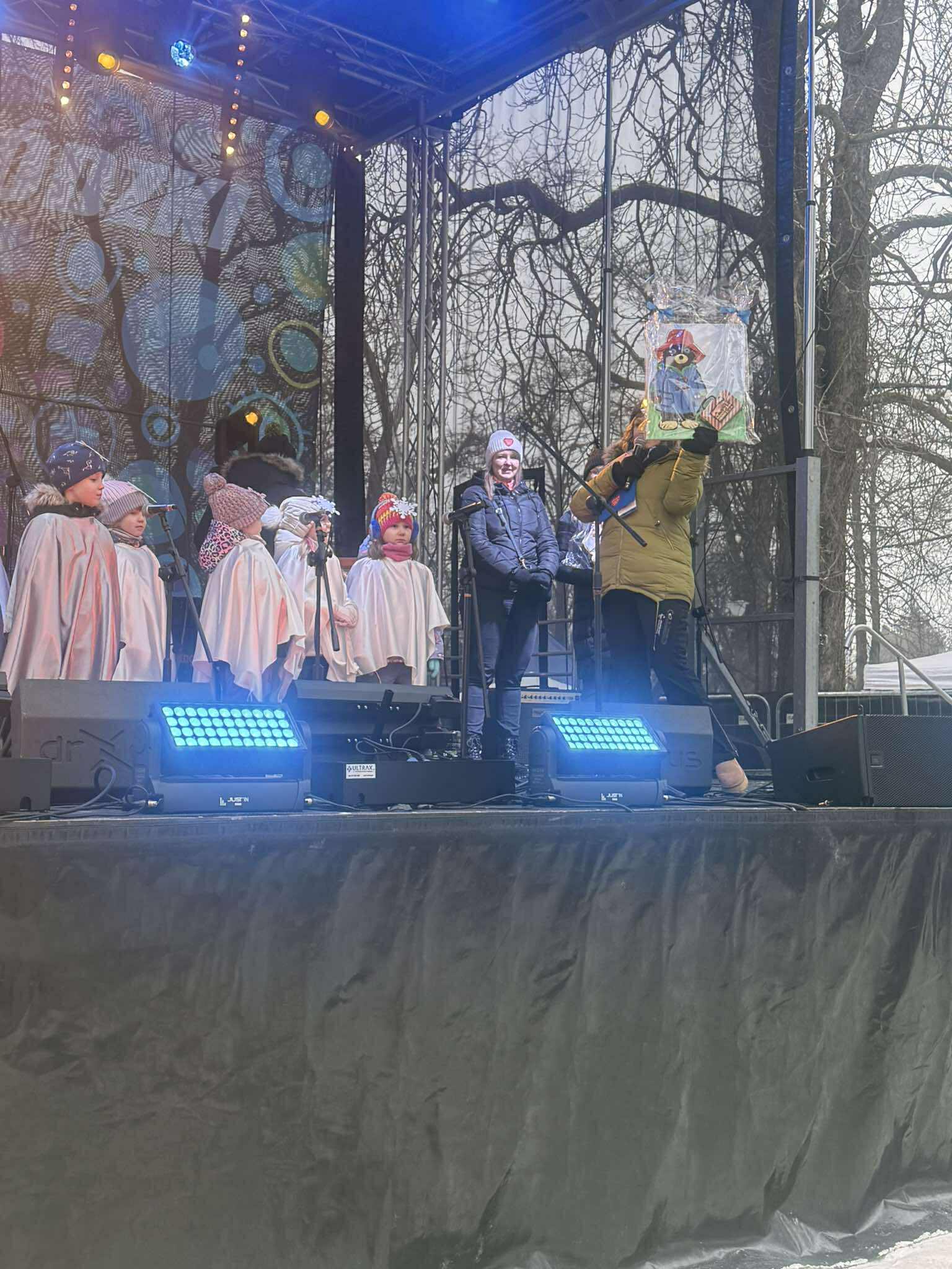Pod licytację wystawiliśmy cztery misie - przestrzenne prace plastyczno-techniczne wykonane przez dzieci wspólnie ze swoimi Rodzicami, a dzieci z grupy VI rozgrzewały serca występem na scenie w Parku Miejskim.